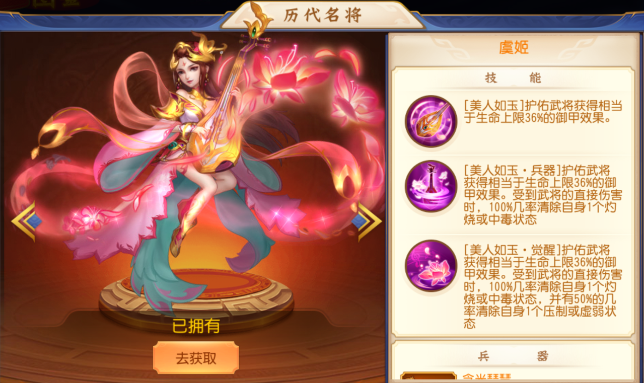 兵器觉醒后增加解除压制和眩晕的能力,机制跟解除火毒一样,但是几率只有50%,关键时候还得看脸面。整体来说,虞姬的使用具有一定局限性,比较多的是针对群雄的毒和虚弱,对周瑜点火影响不是很大,因为没法在周瑜放技能点火之后直接解除掉灼烧,那么依旧会吃到朱雀的伤害;好处就是可以搭配“移花接木”战法来达到双份的解除收益,实战情况下很容易触发解除,所以抵抗异常状态的收益还是可以的,但是当前环境比较少有异常状态的阵容,大多为直观输出的阵容,所以还是常规的秦始皇、汉武帝更通用,虞姬不是很推荐入手!