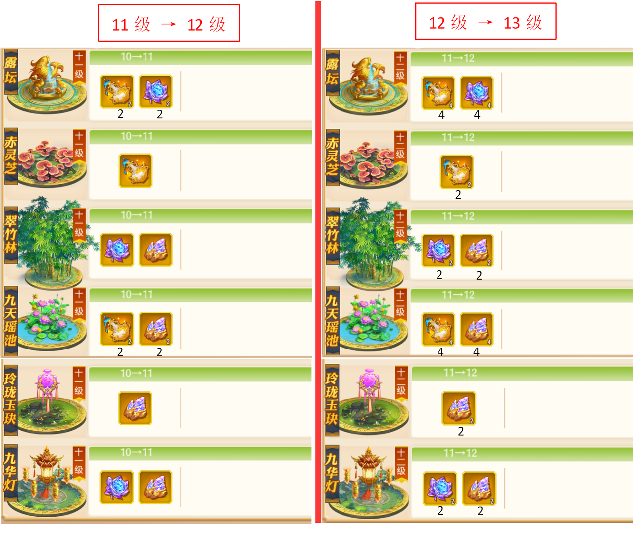 12级和13级神树并没有附加什么特殊的特性,只是上阵基础属性的提升,以下为神树升级需要的材料种类以及数量: