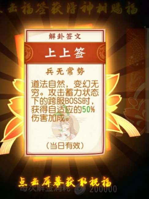 这条祝福的意义很大,可以有效解决当前绝大多数军团在打跨服boos的时候,由于阵营分配不均破盾困难的问题,当天如果有2个对应阵营的玩家抽到此条祝福,那么2个人打的伤害就可以加成为3个人的伤害,破盾概率大大增加!