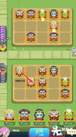 出阵的英雄是根据你下方5个英雄中随机出阵一个,不同的英雄具有不同的属性,拖动相同的英雄和点数一样的英雄可以合成升级,合成后的英雄是下方5个英雄随机一个,比如,两个一级的火英雄,合成后变成了一个二级的毒英雄,输出减弱。