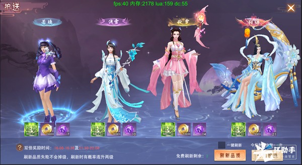 每天的16:00-16:30和21:30-22:00为双倍护送时间,护送可获得双倍奖励。品级越高的仙女,奖励越多;红色仙女轻语高达3倍奖励!刷新仙女消耗护送令,每天可免费刷新2次。刷新时不会掉级,有概率连升2级。
