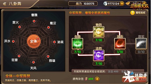利用在征战中缴获的挂签,主公们可以不断填补八卦图,为团队筑基。每种卦形皆拥有超多可升级选项,且稍有区别。中军与四势力可提升生命、物防、法防、攻击、真实伤害五种属性,而四元素则能提升暴击、破击、命中、坚韧、格挡、闪避、重伤七项数值,全面补齐武将短板。
