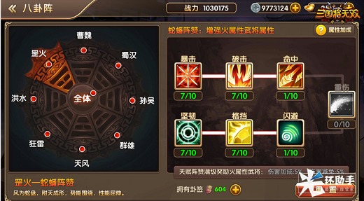 例如将“蜀汉—地载阵赞”强化后,蜀国武将即会增强生命与攻击等力量。而强化“罡火—蛇蟠阵赞”后,所有火属性的武将会提升伤害和防护方面的能力,因此在培养队伍时,也可以多多集结同一种阵营或属性的武将,前期享受到更多的加成哦!