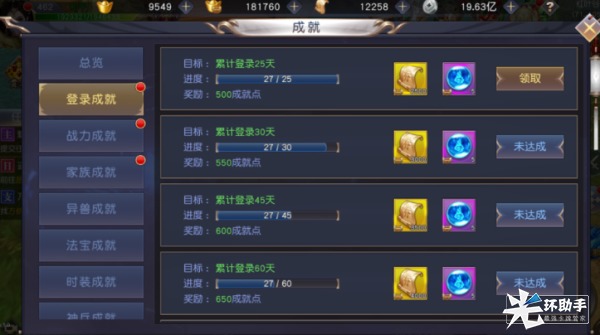 2、成就系统分为“登录成就”、“战力成就”、“家族成就”、“异兽成就”、“法宝成就”、“时装成就”、“神兵成就”、“灵羽成就”、“法相成就”、“首杀成就”十个成就阶段,当玩家完成一个阶段所有成就任务后,点击界面相对应的即可领取该阶段成就奖励。