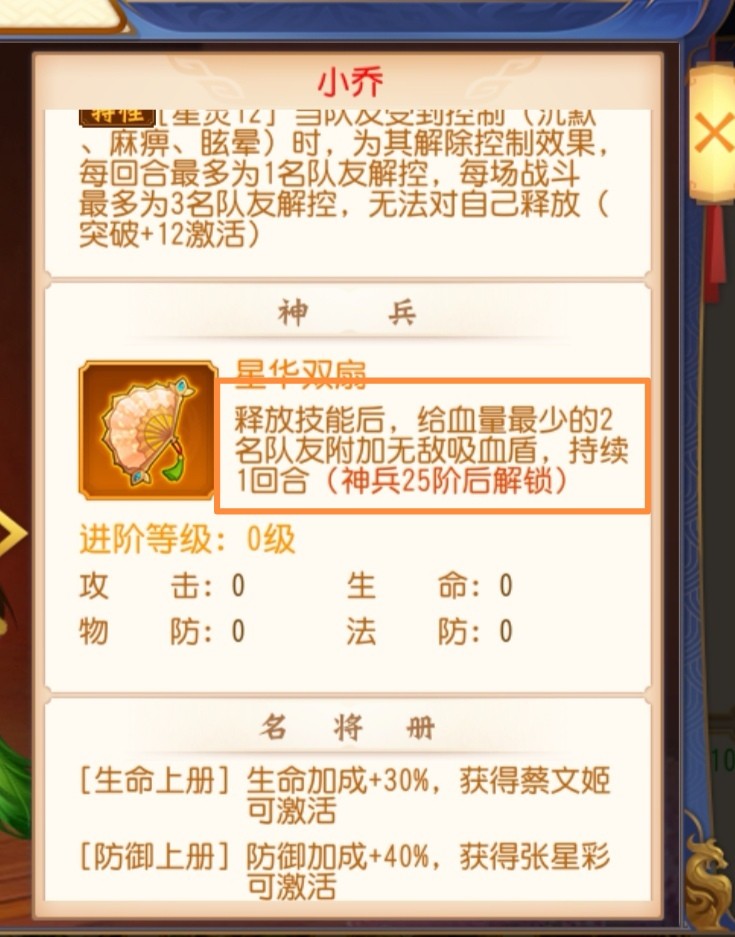 开局选择主角+张飞+小乔。把小乔的神兵快速升到25级。因为小乔神兵25级会触发套2个无敌盾的特性。对于我们前期打架和推图都有非常大的帮助。极限培养张飞主输出。一直暗养孙策。突破和神兵等级需要慢慢培养上去。选择张飞的原因是。