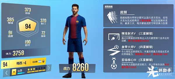 以梅西为例,3星解锁第一个技能“精准射术”,该技能使梅西能够在射门过程中增加伤害,使对方门将体力下降,当门将体力下降为0时,门将的防守力就会变弱,射门难度也将随之降低。