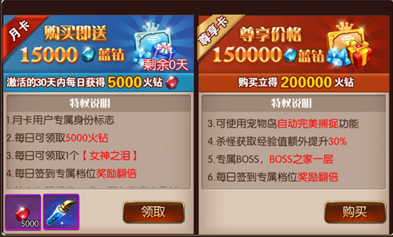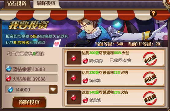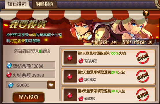 《勇者荣耀(送1666充值礼包)》进阶攻略猫发布于 2020-06-071.进游戏之后,先氪双卡,月卡和尊享卡,月卡买了之后立刻获得15000蓝钻,每天领取8888火钻和女神之泪(装备失败不掉星的道具),12W购买尊享卡,还有专属BOSS,装备时装外观掉落途径+1,经验+30%,签到奖励双倍领取。2.投资:双卡氪完,钻石投资搞一波,所有档位投资都是投资之后立刻回本,每天登录每天领火钻,10倍返还哦巅峰投资:投资之后对应等级领取火钻,这个也是投资之后立刻回本,两个投资一起开通,双倍收益,15倍返还3.:既然是大佬,荣耀壕礼了解下,战力暴涨,外观也同样炫酷独特。游戏内所有的道具都可以在这里获得。 4.百分比加成道具除了开服累充里面可以获得,在每日累充里面也可以获得。PS:每日累充每天都会刷新新的百分比加成道具,以及不同的强化道具,请大佬们每天都关注一下~