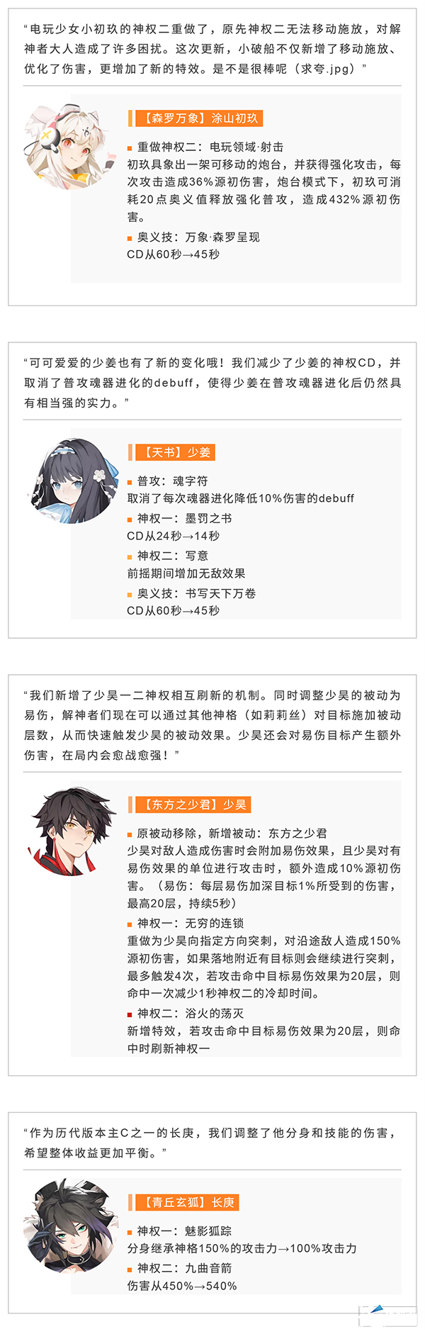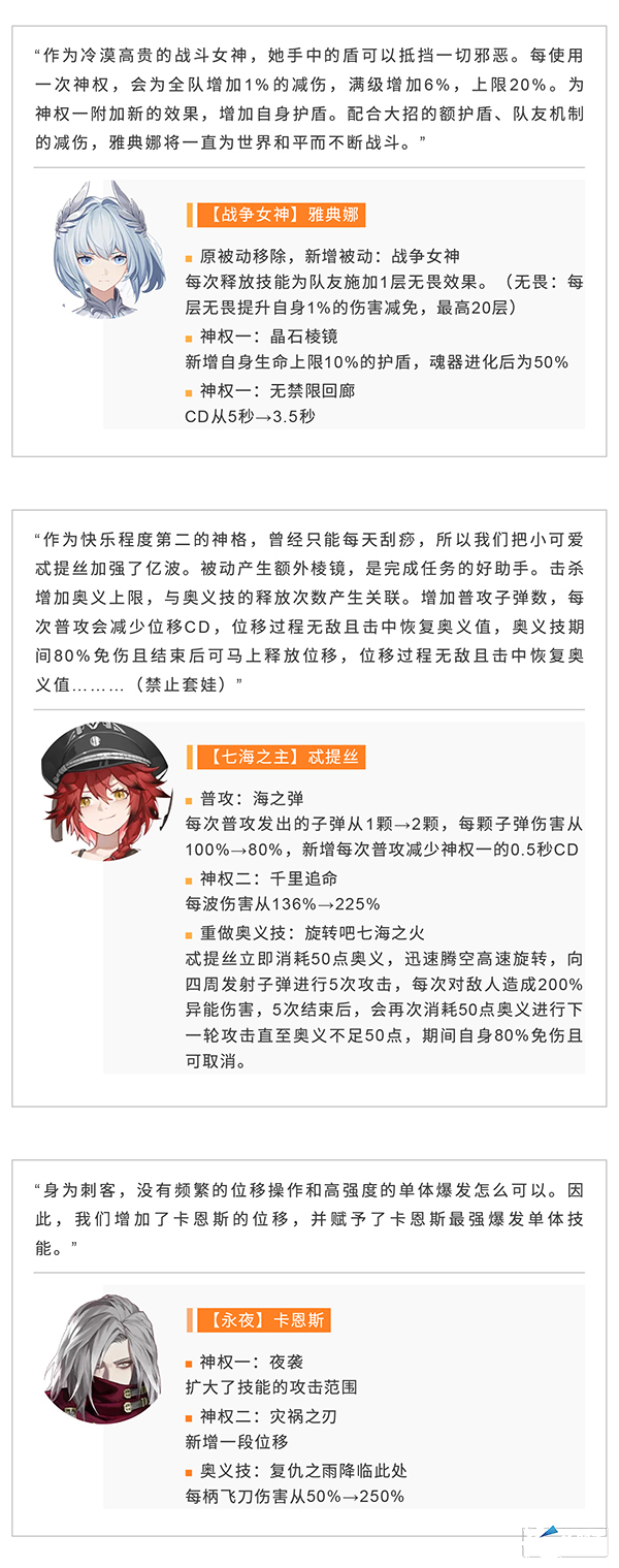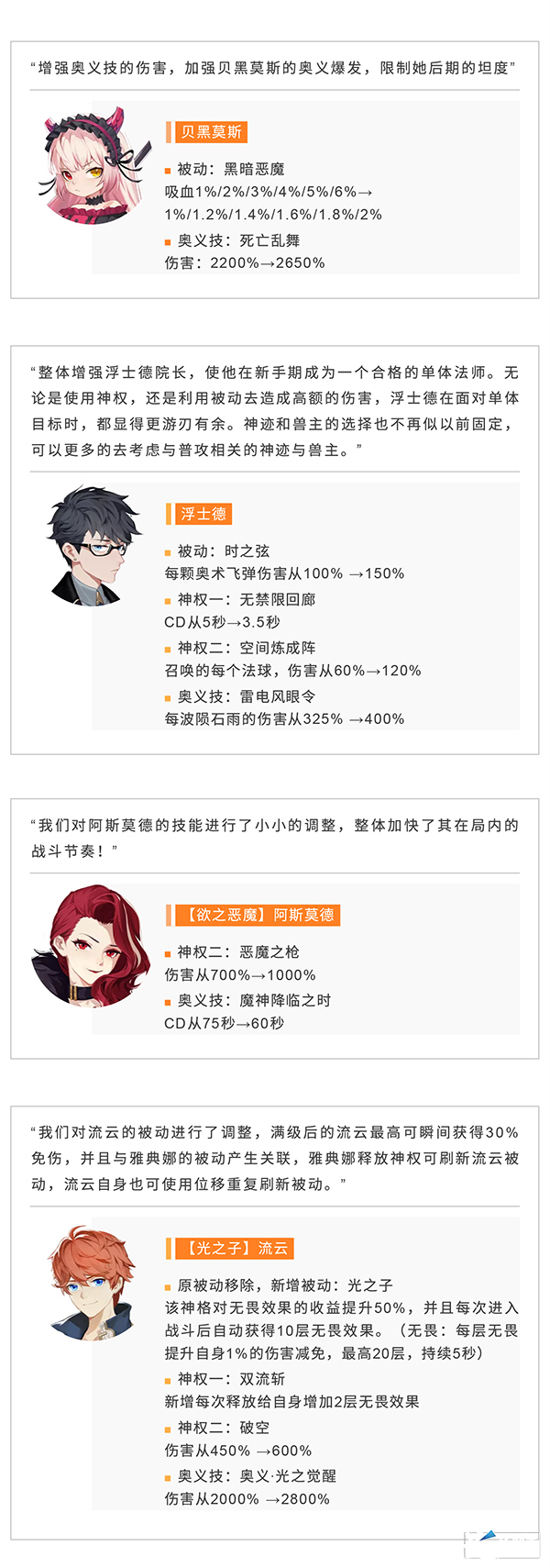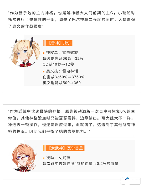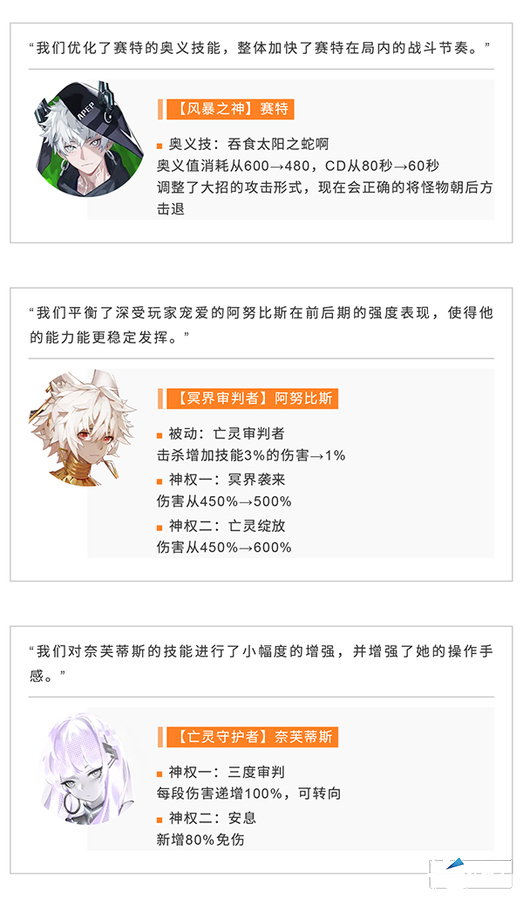 2)梳理了所有神格的伤害,并针对不同神格进行了一些调整,主要降低了一些神格的奥义技能的消耗和CD,增强了伤害,同时也对一些表现超模的角色进行了一定的调整;