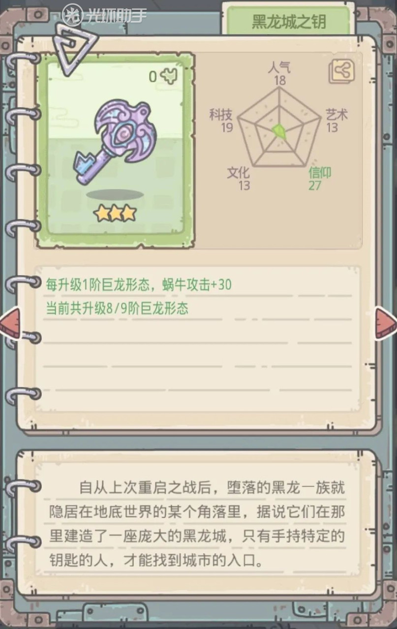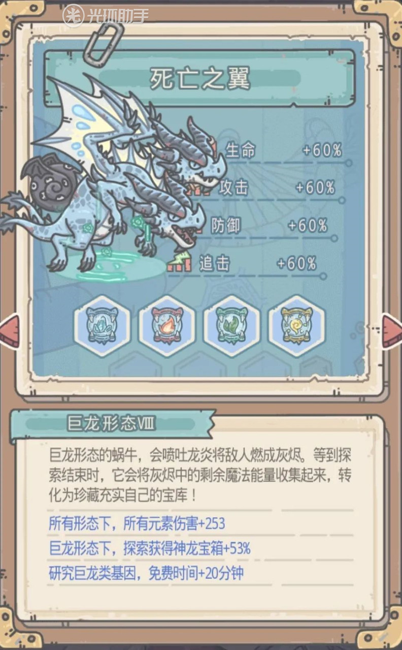 中间格研究一次性获得龙晶贵重碎片X20,即一次性可使用炼金试剂升至满星。觉醒且研究巨龙DNA100级后可增加250点攻击,200点防御,技能为: