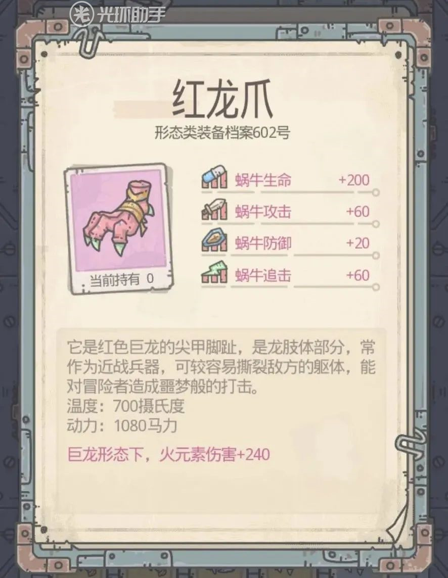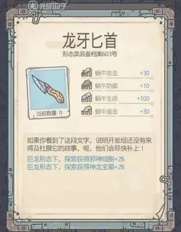 研究完成后可以获得巨龙形态专属装备——龙牙匕首。在巨龙形态下增加探索获得魔神细胞与神龙宝箱,属性非常强力,更是可以与第15次神龙许愿获得的红龙爪(巨龙形态下增加火元素伤害)合成为红装+1形态。