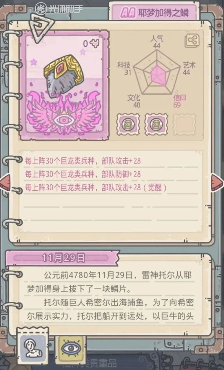 中间格研究获得耶梦加得之鳞碎片,共计3次,分别获得20/20/40碎片,觉醒后贵重属性为每上阵30个巨龙兵种部队防御+28,部队攻击+56。技能为: