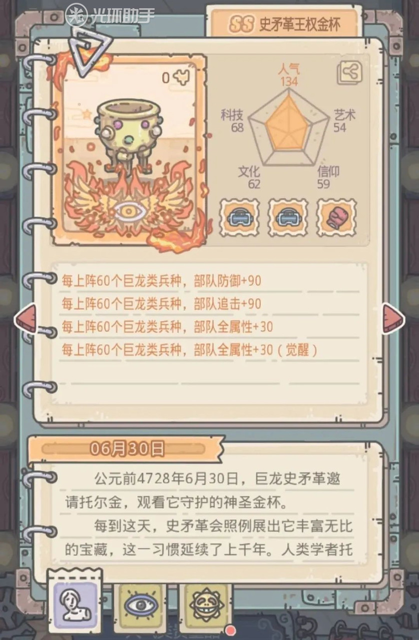 研究完成后获得史矛革王权金杯贵重碎片,共计5次,共获得280碎片,觉醒属性为每上阵60个巨龙兵种部队防御+90,追击+90,全属性+60,解锁最后的巨龙幻境,技能为: