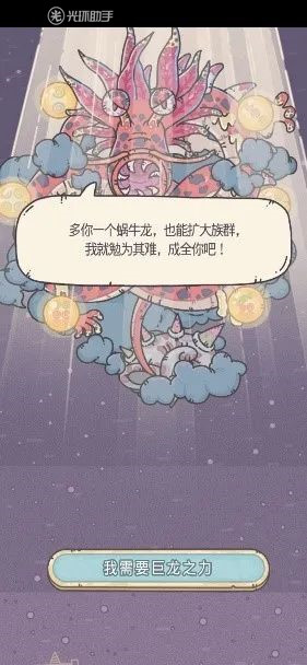 在其余五种形态均达到五阶后,可以在DNA特惠礼包中购买回馈,获得巨龙进化基因,使用后会解锁巨龙形态,使用巨龙形态时蜗牛攻击、防御、追击以及生命均巨额加成(不会因为阶数提升而加成不同),探索时产出神龙宝箱(宝箱能开出的都是好东西,因此在其他形态获得奖励做完后,强烈推荐巨龙探索)数量增加,以及研究巨龙类基因会免费加速一定时长。巨龙形态在当前版本中,在觉醒橙色贵重达到一定数量的情况下还会增加所有元素伤害(全形态生效)