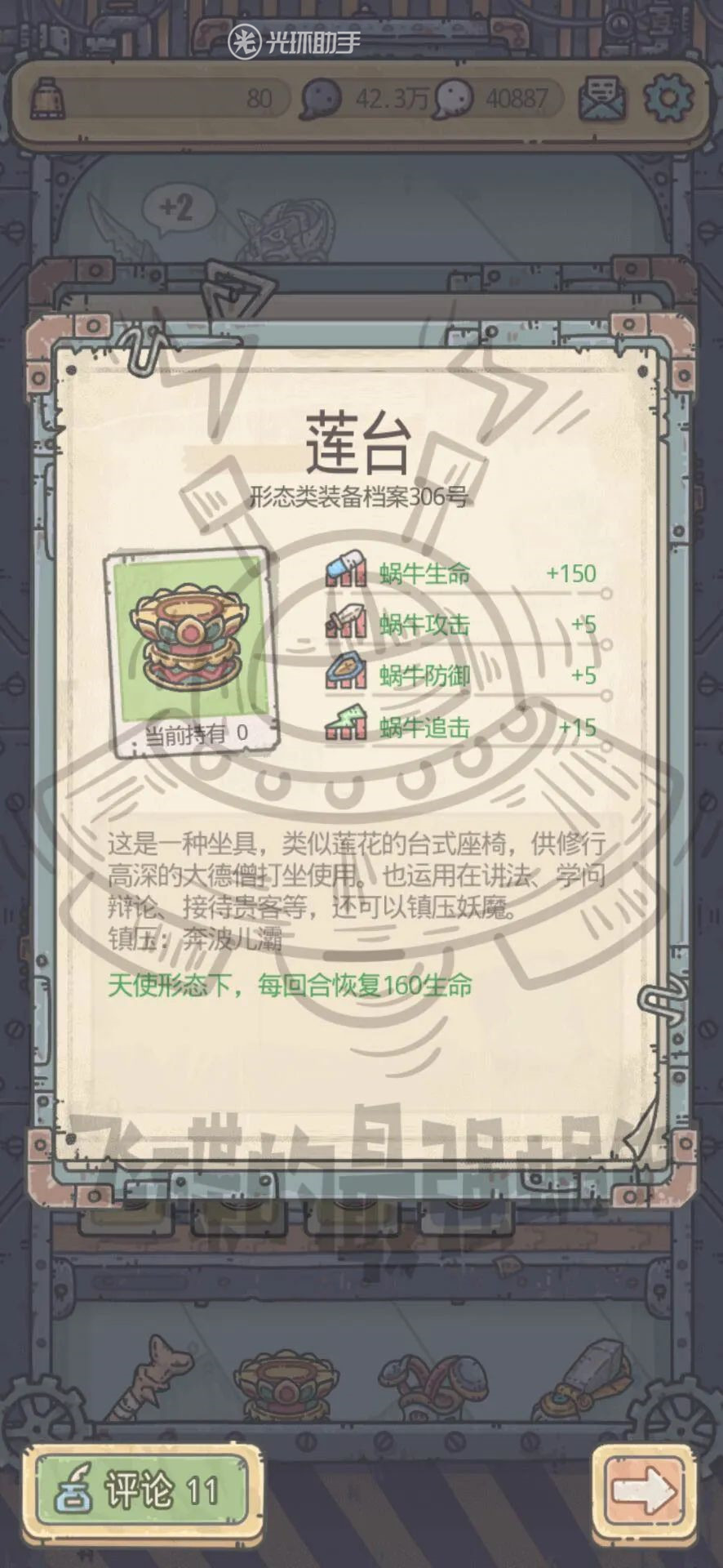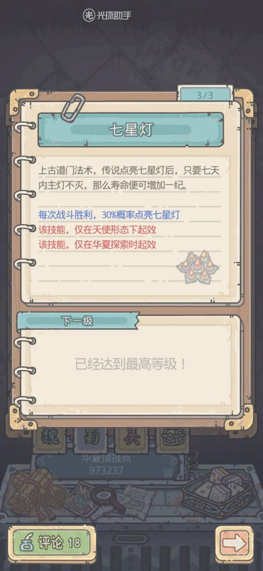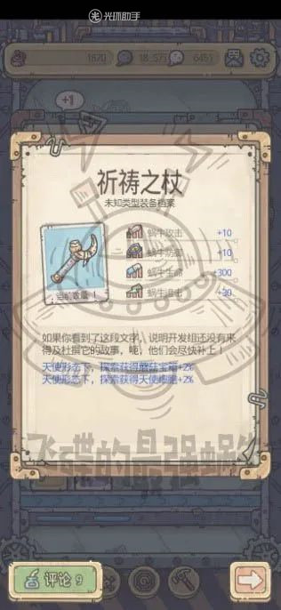 研究完成后可以获得天使形态专属装备—祈祷之杖。在天使形态下增加探索获得天使细胞与蘑菇宝箱,更是可以与鼠胆侠胜利奖励装备莲台(天使形态下每回合恢复生命)合成为红装+1形态。