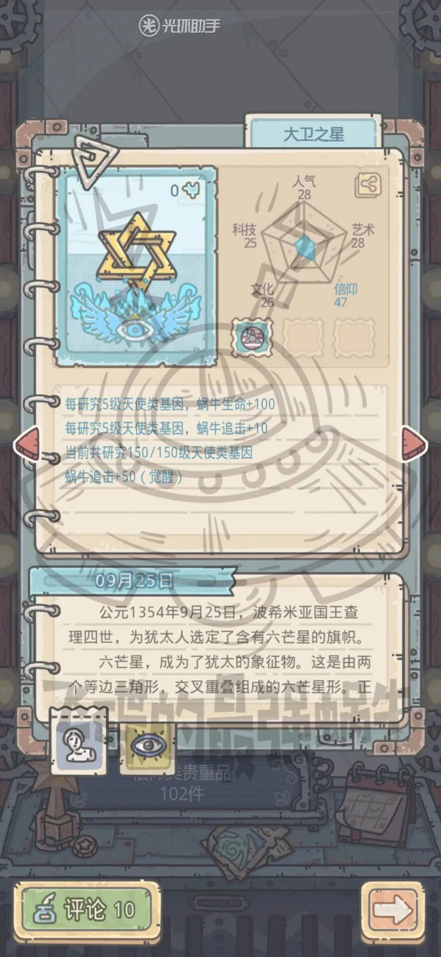 基因研究是指解锁第一个特殊形态(一般指活尸形态)后,完成超神基因专员拜访事件后,即可激活基因研究功能,通过研究可以获得许多不同的加成,包括五维加成(人气、文化、信仰、科技、艺术统称五维)以及四维加成(攻击、防御、血量、追击),当然还包括每阶的特殊研究,获得专属于该形态的加成。接下来我将详细地讲解一下天使形态的基因研究加成。
