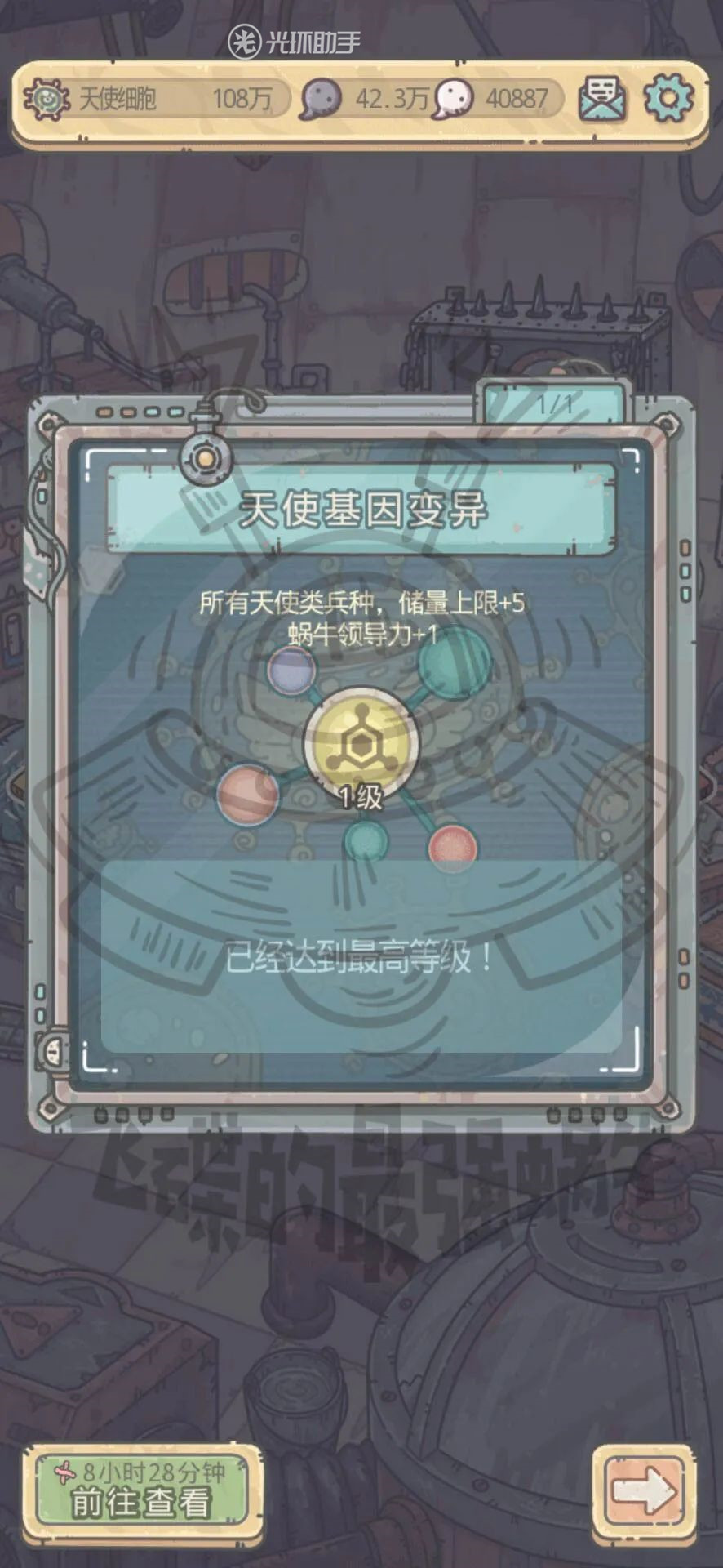 研究完成后蜗牛领导力+5,所有天使兵种储量上限+25,八阶天使目前很少有人达到,但是对于兵种储量上限加成还是很大的,而领导力嘛,感觉数值设定很飘忽,橙色蘑菇每食用到一定数量会领导力+10,并且由于神域版本未开启,没有感受过领导力作用大小,因此仅提供数值对比,不做评论。