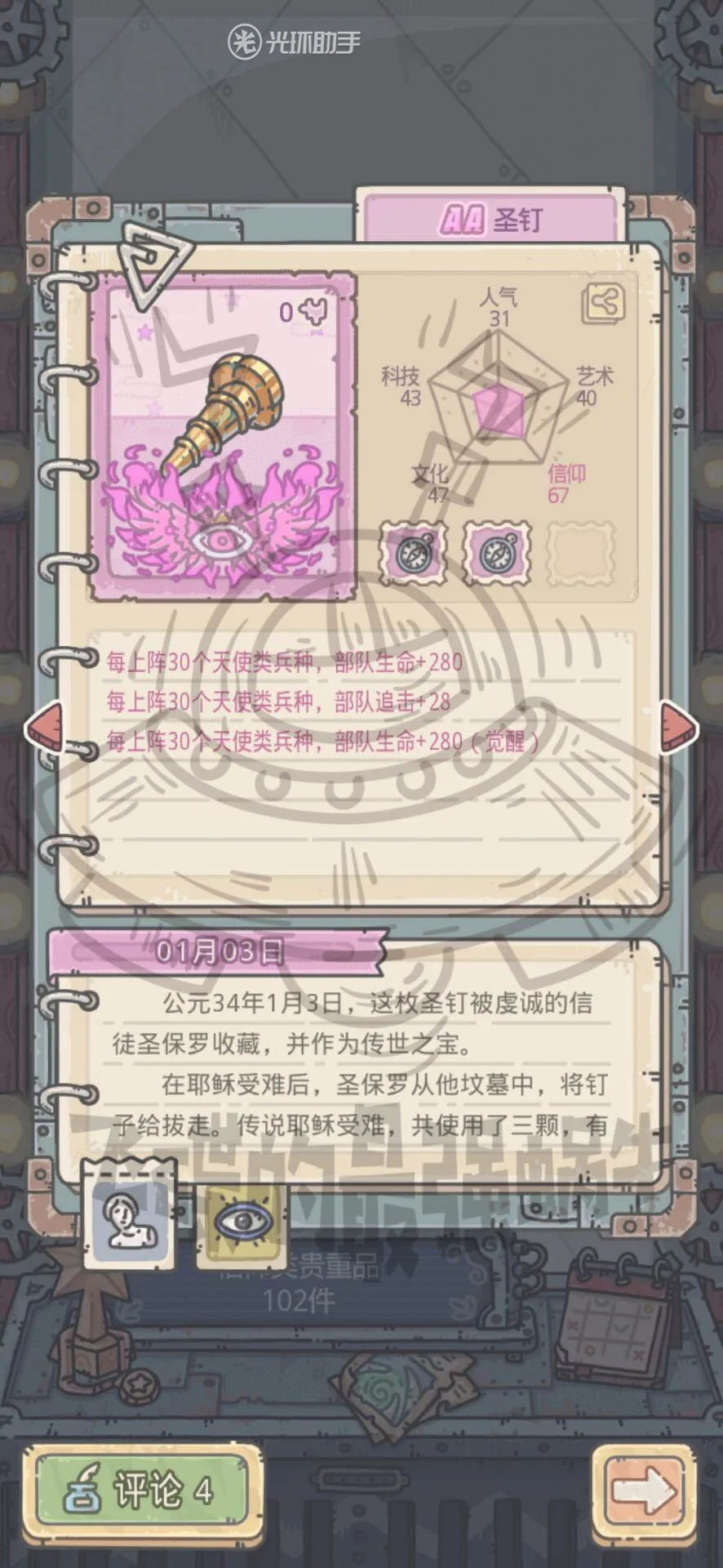 中间格研究获得圣钉碎片,共计3次,分别获得20/20/40碎片,觉醒后贵重属性为每上阵30个天使兵种部队攻击+28,部队防御+56。技能为: