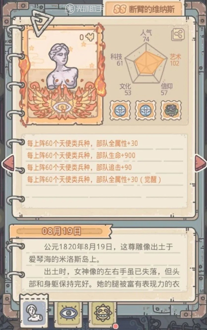 研究完成后获得断臂的维纳斯贵重碎片,共计5次,共获得280碎片,觉醒属性为每上阵60个天使兵种共计部队追击+90,生命+900,全属性+60,解锁维纳斯的手臂幻境。技能为: