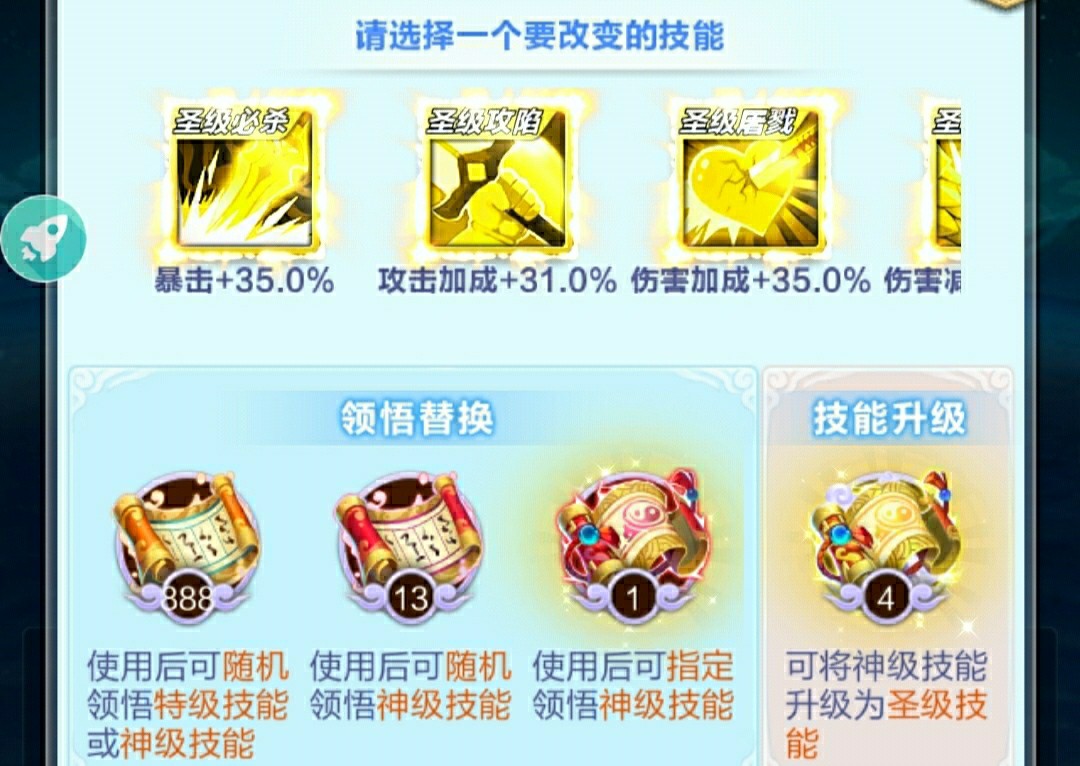 ★点开技能领悟,选择需要升金的红色技能,使用金宠物要诀可以提升升金进度以及技能属性,每个红色技能使用三本金宠物要诀可以成功升金。升金以后可以继续使用金宠物要诀提升属性,金色技能使用三本金宠物要诀以后属性达到上限,这时候技能边框会闪闪发光。