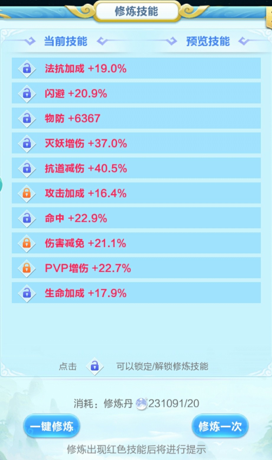 (2)洗练出一个目标属性以后锁定,然后继续洗练。