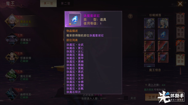 神魔禁地:神魔禁地掉落为个人归属,击杀该地图下魔王和精英怪物均会增加怒气,怒气满100将会被逐出副本,场景内每1分钟自动增加1点怒气,死亡会增加20怒气。神魔禁地魔王主要产出套装石,而精英怪物则产出套装石碎片,可通过合成,获得套装石。