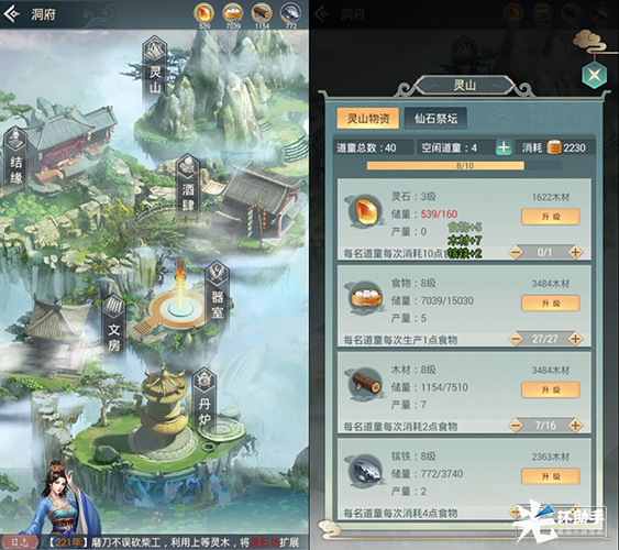 灵山可以产出各种资源,这些资源可用于洞府其他地区,以及聚灵阵的升级。洞府基础资源分为灵石、食物、木材、镔铁。升级灵山的主要资源为木材,闯荡的主要资源为食物,升级聚灵阵的主要资源为木材和陨铁。道童可消耗食物或者在仙缘中获得,可根据自己的需求进行分配,当道童参与食物以外的工作时,将消耗食物,如果食物总量为0且10秒食物产出<1,那么灵山所有资源产出都会暂停,请让道童们吃饱了,才有力气干活哟。