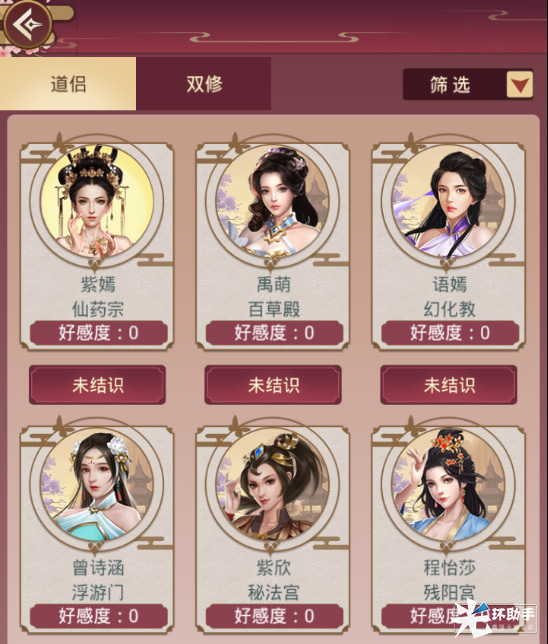 外出巡游,拜访宗门所遇到的仙缘道友,可在会客室交谈论道,切磋道行或者赠送礼品,当亲密度满后亦可与其结为道侣,共同修炼。与道侣共同修炼会根据道侣所擅长的功法类别提升修行,有许多种不同的效果,当你升入仙途之时,也有机会邀请道侣一起上天,成为你的仙仆。