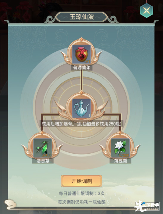 酒肆可以进行酿酒操作,调制出的仙酿可以增加人物属性,是每日必进行的日常操作之一,每日可进行3次普通调制和3次极品调制,仙酿分为4个类型,同类型普通调制和极品调制仅是需要的仙酿不同,其他药材是一致的。药材可以通过闯荡关卡获取。收纳于行囊的须弥戒中。仙浆和仙酿除了直接购买调制,一些活动也可以获得。