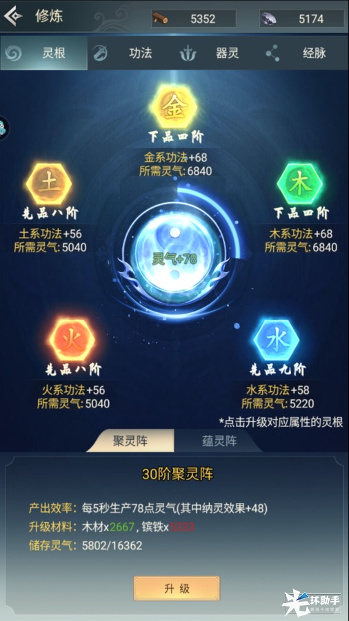 灵根将比例提升功法的属性,在灵界仙都中,所有功法均有金木 水 火 土五行属性中的一种,提升灵根将直接增加对应属性功法所增加的属性。升级灵根所需的灵气由聚灵阵产生,聚灵阵的等级越高,灵气获取速度和灵气上限也会越高。当前灵根的等级上限也是由聚灵阵中灵气上限决定。
