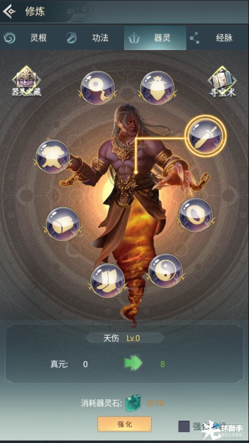 器灵拥有8个星位天罡、天枢、天璇、天衡、天伤、天权、天玑、地煞。每个星位将对应真元、筋骨、步法、气血中的1-2项,升级器灵将直接增加对应属性。升级器灵所需的器灵石通过寻宝获得,在坊市或者活动中获得寻宝图后,前往对应关卡中的地点,可以获得一定数量的器灵石及锻造材料。