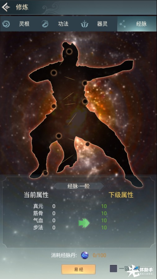 升级经脉可以对属性进行平均的提升,当经脉提升到一定程度,除四项基本属性外还将提升感悟和纳灵,增强修行和灵气获取的速度。经脉丹主要通过地宫获得,在到达洞虚一阶后,在闯荡中解锁地宫机关即可获得经脉丹及少量属性天丹,当一个关卡的全部机关突破后,需要战胜最后的boss才可进入下一关卡,每日均可扫荡地宫一次,获得已通过的全部关卡的奖励。