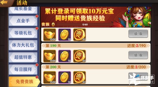游戏内的活动还是比较丰富的,常见等级礼包、成长基金、每日签到、累计充值、累计消费等等。万万没想到还有每日登陆送贵族、元宝,并且延续到500天! 长达500天的赠送也是超乎我的想象。并且上线就送一万元宝,玩个半个小时就送了三十连抽,可以说这款游戏,只要够肝,平民也能霸服~