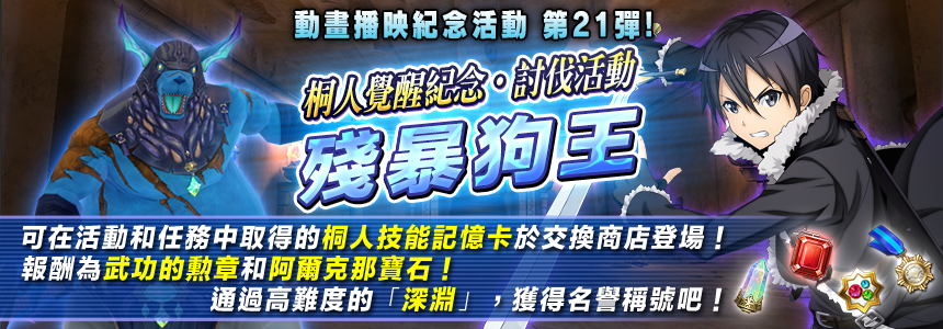 可获得所有能在活动和任务中取得的桐人技能记忆卡!桐人觉醒纪念・讨伐活动「残暴狗王」登场!