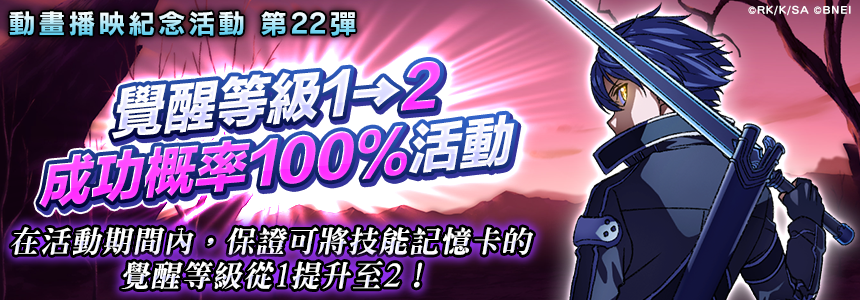 《刀剑神域:关键斗士》觉醒100%成功活动开始小小闷发布于 2020-08-20 为纪念电视动画《刀剑神域Alicization War of Underworld》最终章中桐人觉醒,「觉醒等级1→2成功概率100%活动」正式登场。 ▼活动内容 在活动期间内让技能记忆卡「觉醒」,保证可从等级1提升至等级2! ▼活动期间 2020年8月19日(三)游戏维护后至2020年9月2日(三)游戏维护前(JST/UTC+9) 详情请确认游戏内公告。