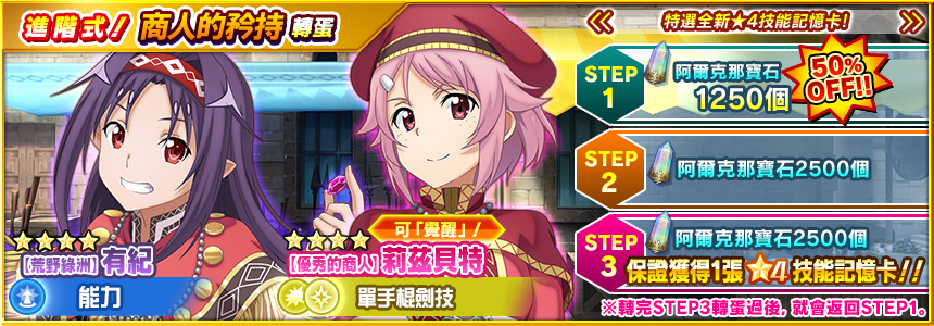 「商人的矜持转蛋」以进阶式转蛋的形式登场!品项包含特选的全新★4技能记忆卡「【优秀的商人】莉兹贝特」与「【荒野绿洲】有纪」!