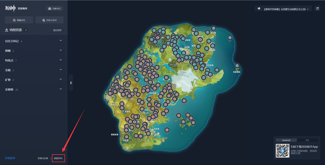 在资源选择面板中,可以点击右下方的“数据存档”生成一条专属您的地图存档链接,请务必妥善保管好该链接。后续在任意的浏览器打开该链接都能实时保存你的标记数据。