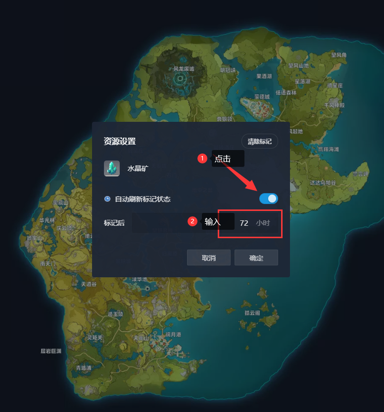 例:这里是水晶资源,我们点击按钮开启,设置好时间(72),后续某个水晶点位被标记后72小时就会刷新为未标记状态,也就是从透明变成了亮起的状态。方便大家了解某个点位的资源采集情况。