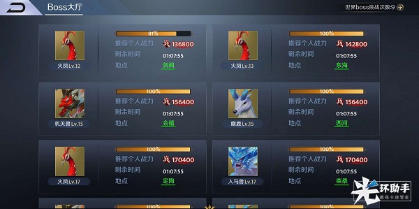 打开右上角的boss大厅,可以查看到各个等级不同的世界boss,同时上面还显示了该boss的剩余血量,推荐个人战力,剩余攻打时间以及boss出现的地点;主公可以根据您当前的战力,选择适合的boss进行攻打哦,也可以和好友组队,挑战更高等级的boss。