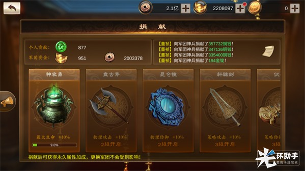 玩家加入到军团后,可以通过捐献功能,获得对应的属性值,从而提升自己的战斗力!捐献的属性是一直存在的,不会因为玩家离开军团而消失!