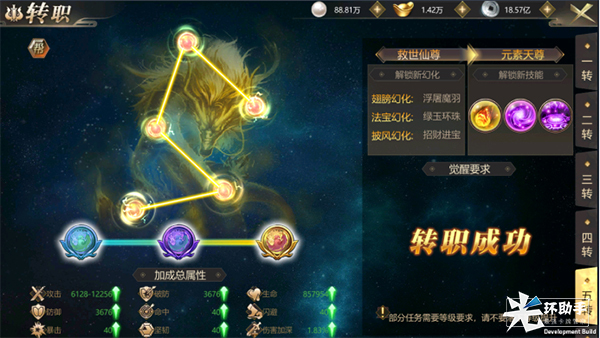 其中不同的角色有不同的技能,随着等级开放。上图中圈红的两个技能,分别在角色三转和四转的时候开放,带给仙友们更强大的手段。当仙友们转生的时候,特定技能也会自动随着转生成功而升级为对应的更加强力的技能!
