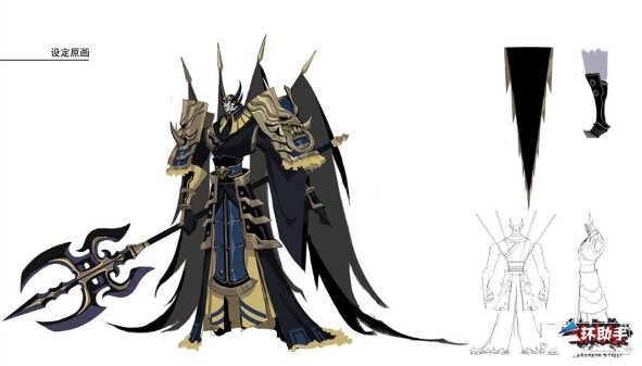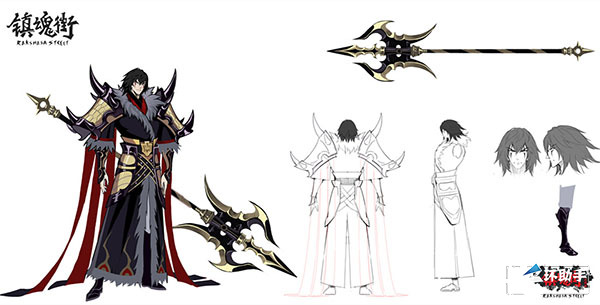 下面是大家期待的项昆仑设计过程:角色立绘在漫画和动画的基础上,做了更细节化的调整,对服装、武器、神态等元素的设计进行反复揣摩,尽最大努力保证人物形象、饰品等细节更贴近原著。灵衣是以黑色为主色调的乌金甲,配上虎皮红战袍,武器是项羽赖以成名的霸王戟,戟杆一端为金属枪尖,两侧又有月牙形利刃与枪尖相连。