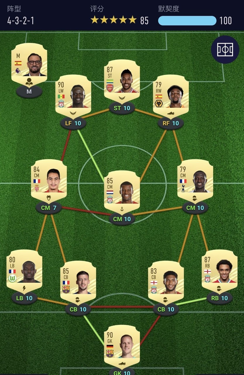 以我的阵容为例,戈麦斯与阿诺德同俱乐部同联赛是超级绿,因此戈麦斯抵消了特尔施特根+朗格莱带来的两条红线负面影响。马内与维纳尔杜牧两人同俱乐部普通绿线抵消了本爷的红线影响。而本爷就没那么幸运,由于只有两条黄线两条红线,因此失去了3点默契,而且我现在没有法国教练,为了不修改lw和rw 的位置,经理联赛也选择了英超而非法甲,所以本爷目前只有7化学。