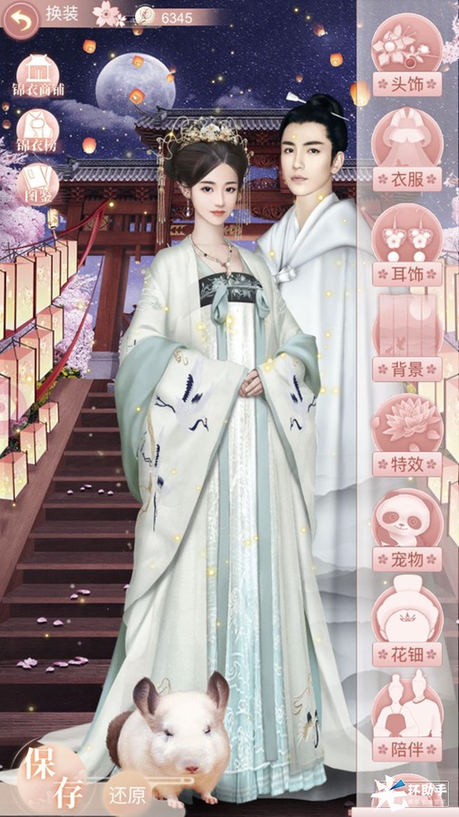 点击主界面的“换装”按钮即可进入换装界面,右侧可以更换已获得的头饰、服装与陪伴的角色,如果获得了整套的服饰也可以通过“套装”直接更换。更换完毕后点击“保存”即可,若有不满意之处,也可以点“还原”,然后再次穿上自己的心仪服饰。