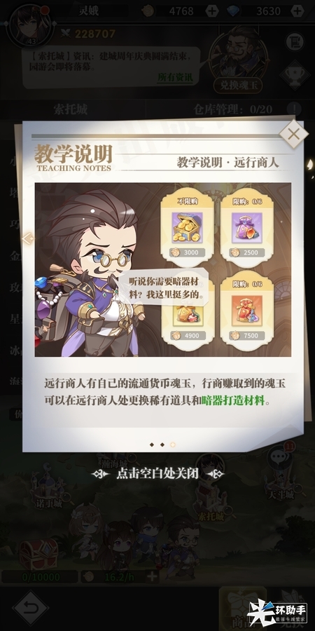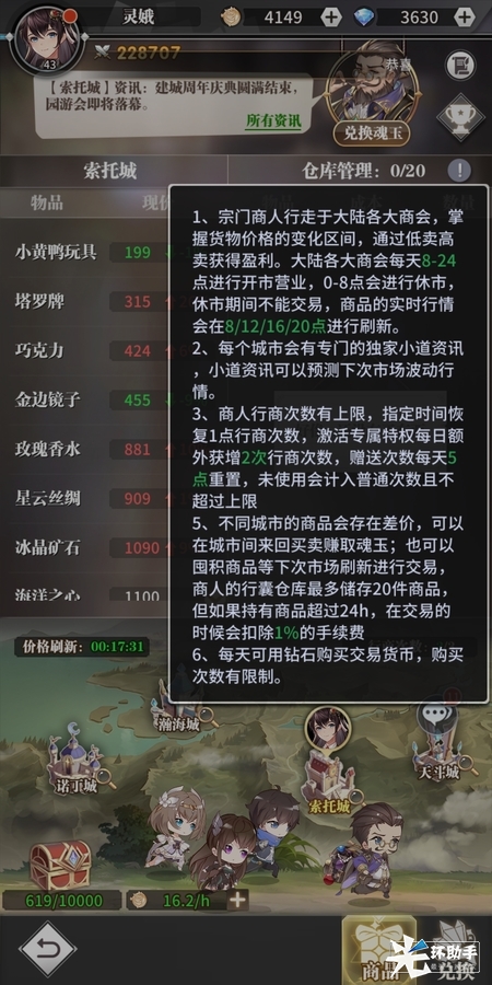 远行商人游走于大陆的各大商会,通过低买高卖获得盈利,大陆各大商会的商品价格均不相同,且价格在8/12/16/20点分别刷新一次。每天8-24点商会营业,0-8点休市,休市期间无法交易。