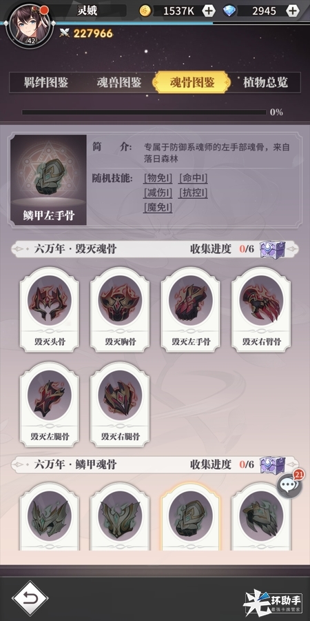 魂骨图鉴记载着全部魂骨套装,相当于玩家的出装参考,提供了全部套装的随机技能,如鳞甲套就是物免、魔免、减伤、抗控和命中。植物图鉴则需要玩家在药堂中种植药草才能解锁,详细记录着各种药草提升的好感度。