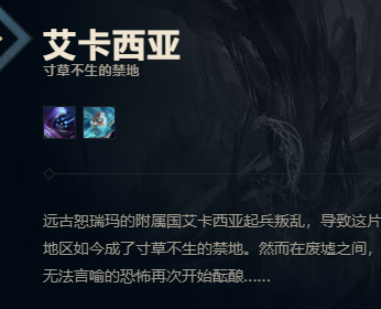 艾卡西亚本来是大陆南部古老的一个城邦,但一系列的意外和仇恨彻底摧毁了它,虚空之地也逐渐取代了艾卡西亚的名字。