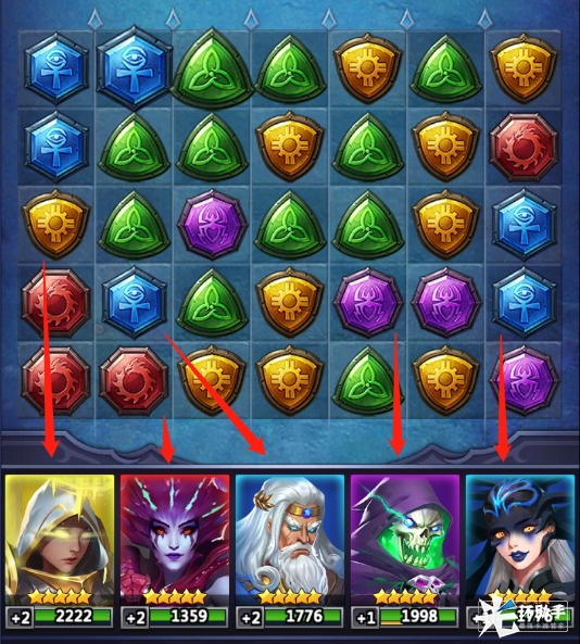 1、三消玩法中,通过消除对应颜色的棋子,英雄可以攒取法力,法力值攒满即可选择释放技能;