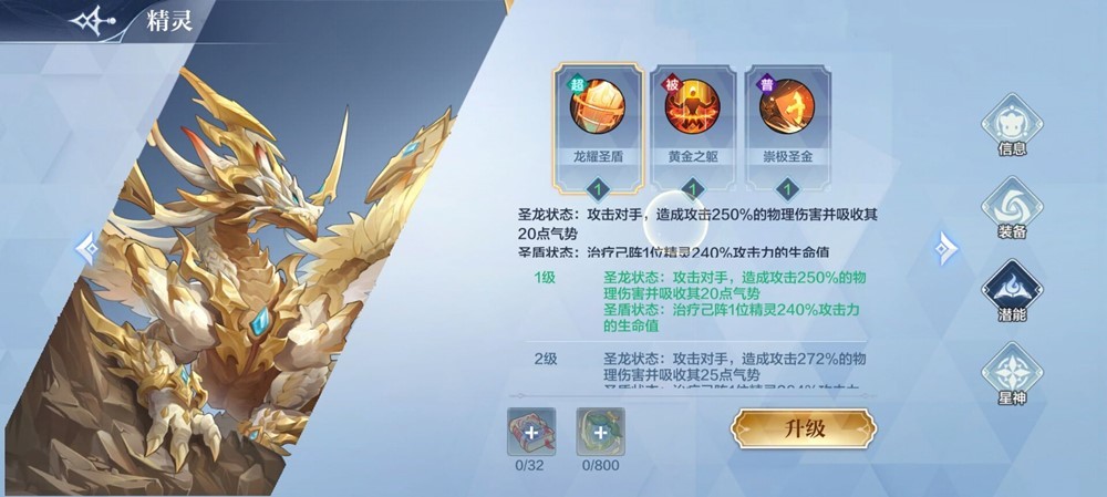 圣光飞龙,受到致命伤后可以无敌回血并变换形态,既能输出又有一定保命效果,同时英雄技能加强全队的属性加强输出,还有羁绊作用