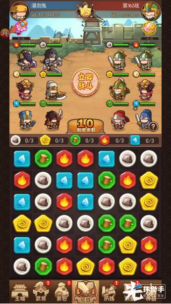 在PVE战斗环节增加独特的三消玩法,战前操作的方式,每个色块代表的对应的武将的位置(金、木、水、火、土、阵眼)