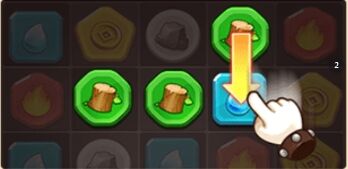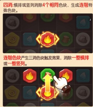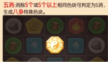 三消:与相邻色块交换,3个相同色块相连完成消除,横排或竖列消除4个相同色块,生成连弩特殊色块,连弩色块产生三消色块触发效果,消除一整横排或一整竖列;消除5个或5个以上相同色块可判断为5消,生成八卦特殊色块。